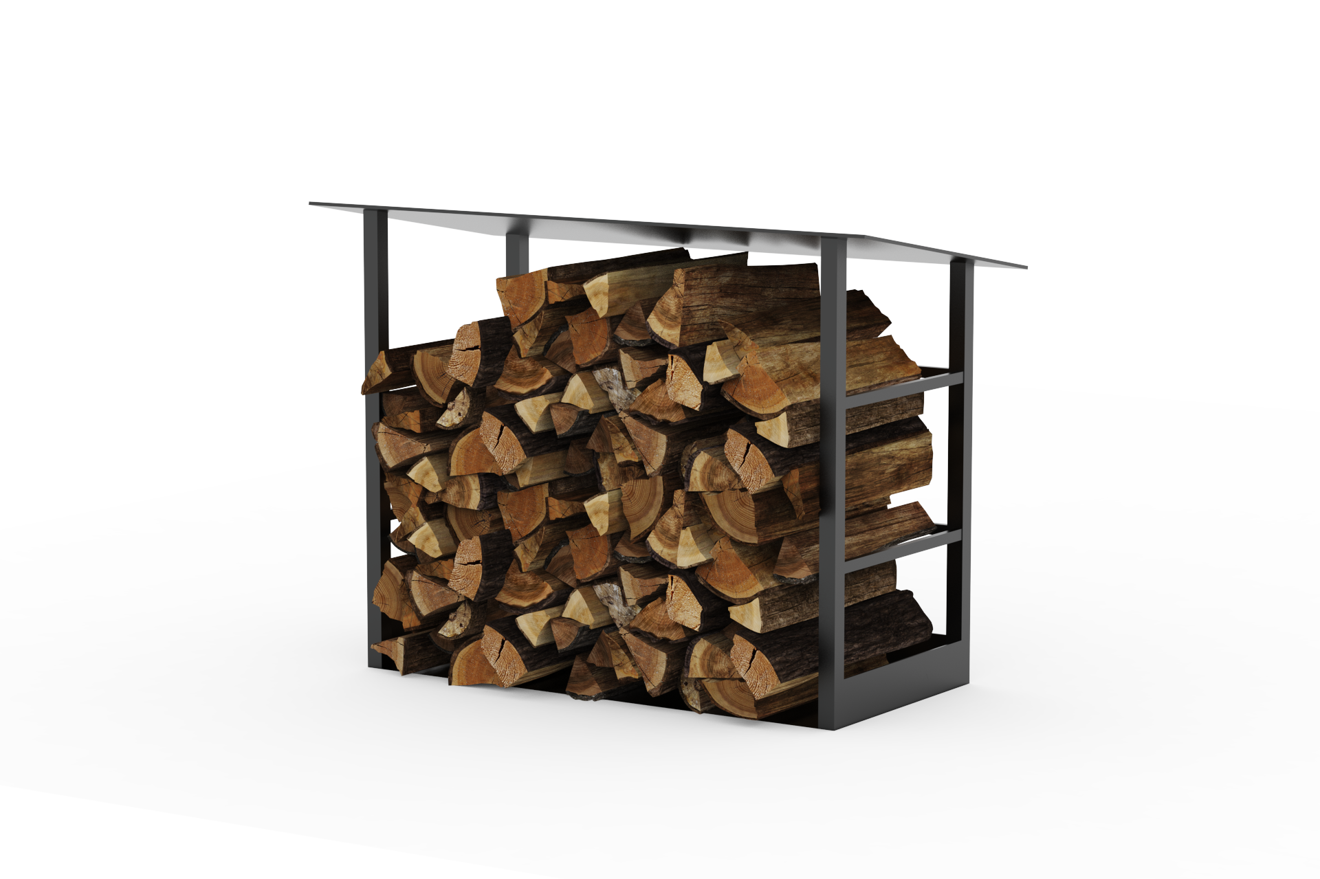 Outdoor firewood stand made of metal profiles. Easy assembly and disassembly. The stand can be fitted with a modular panel with pins for attaching tools.